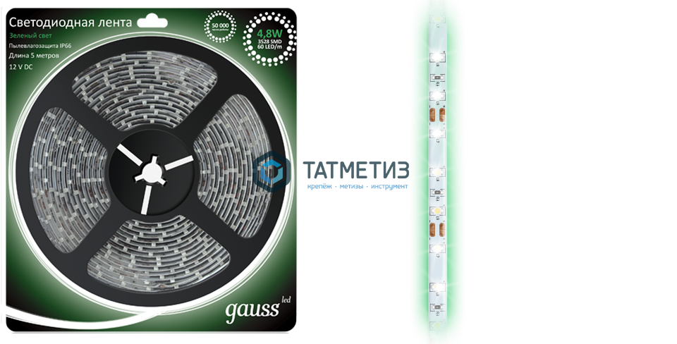 Лента GAUSS LED 3528/60-SMD 4.8W 12V DC зелёный IP66 (5 метров)
